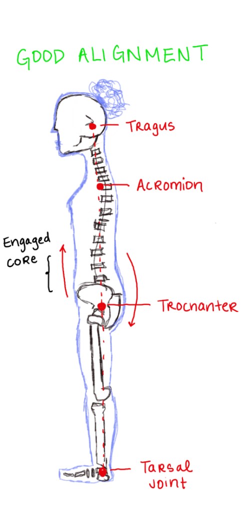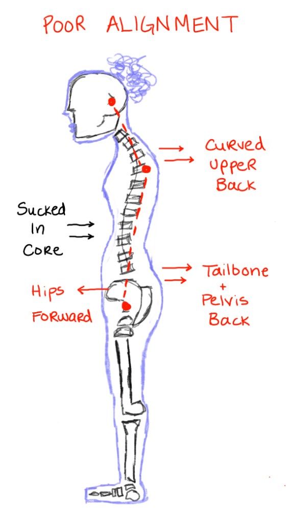 The way that I work on finding alignment is quite literally by standing parallel to a mirror, comparing my body placement to a diagram such as the one above, and then physically using my hands to try to manipulate my placement. You should be able to literally feel your cervical, thoracic, and lumbar spine align with the crown of your head.